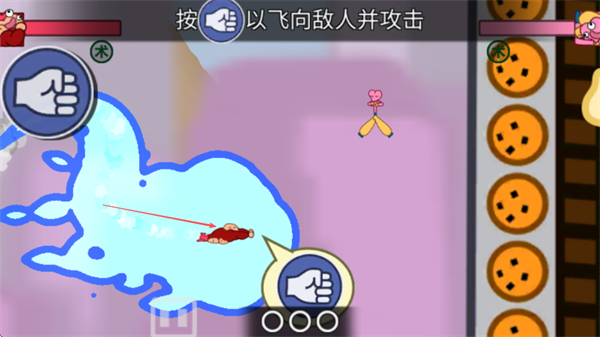 1、点击拳头按钮,操控角色飞向敌人并攻击,在蓝色区域内发起进攻。
