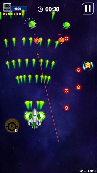 4、不断清理敌群、收集道具,维持战机生存,冲击更高分数。