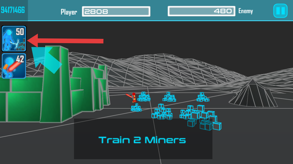 2、点击箭头指向的矿工训练图标,训练矿工单位,矿工可用于采集资源,为后续训练战斗单位、提升战力提供资源支持。