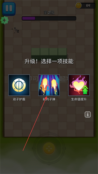 4、升级时选择技能如双子护盾、前向子弹、生命值提升,增强角色战力,持续推进关卡,击败所有敌人,完成拱廊猎人的战斗挑战。
