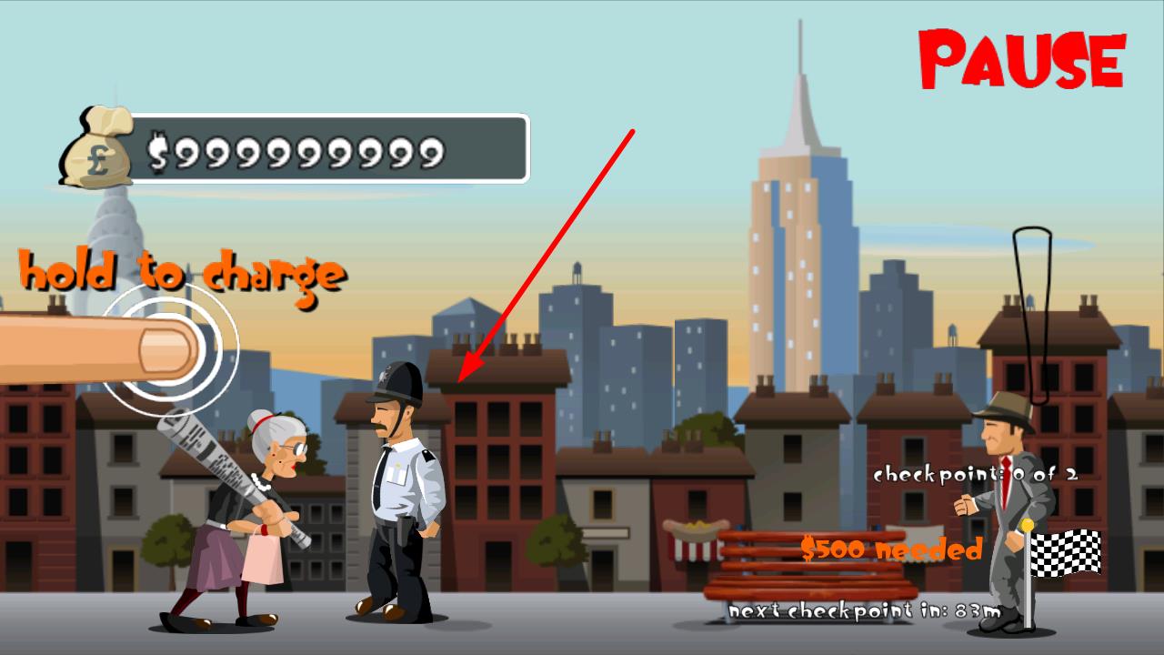 2、进入游戏后即按住屏幕可以为老奶奶的攻击蓄力,她手持一根棒球棒,在大街上到处打击路人,从路人身上收集金钱。