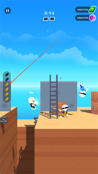 2、瞄准敌方目标,发射子弹,利用子弹弹射消灭多个敌人。