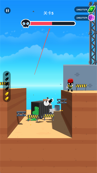 1、在关卡5中,瞄准敌方目标,发射子弹,利用子弹弹射消灭敌人,注意上方进度条显示的关卡进度。