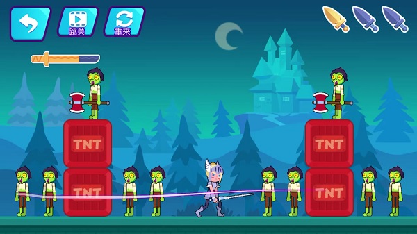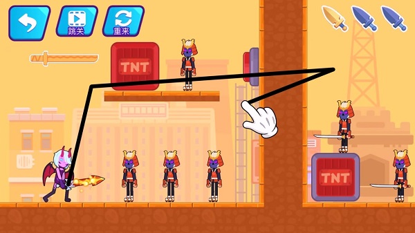 2、游戏中途,面对愈发复杂的关卡与数量增多的敌人,灵活调整移动路线,利用环境优势锁定目标,力求以最少出刀次数消灭敌人,避免生命值损耗。