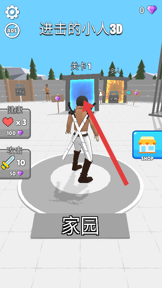 1、在进击的小人3D游戏的家园界面,点击关卡1的传送门进入游戏,界面中可看到角色的健康和攻击属性,以及商店入口。