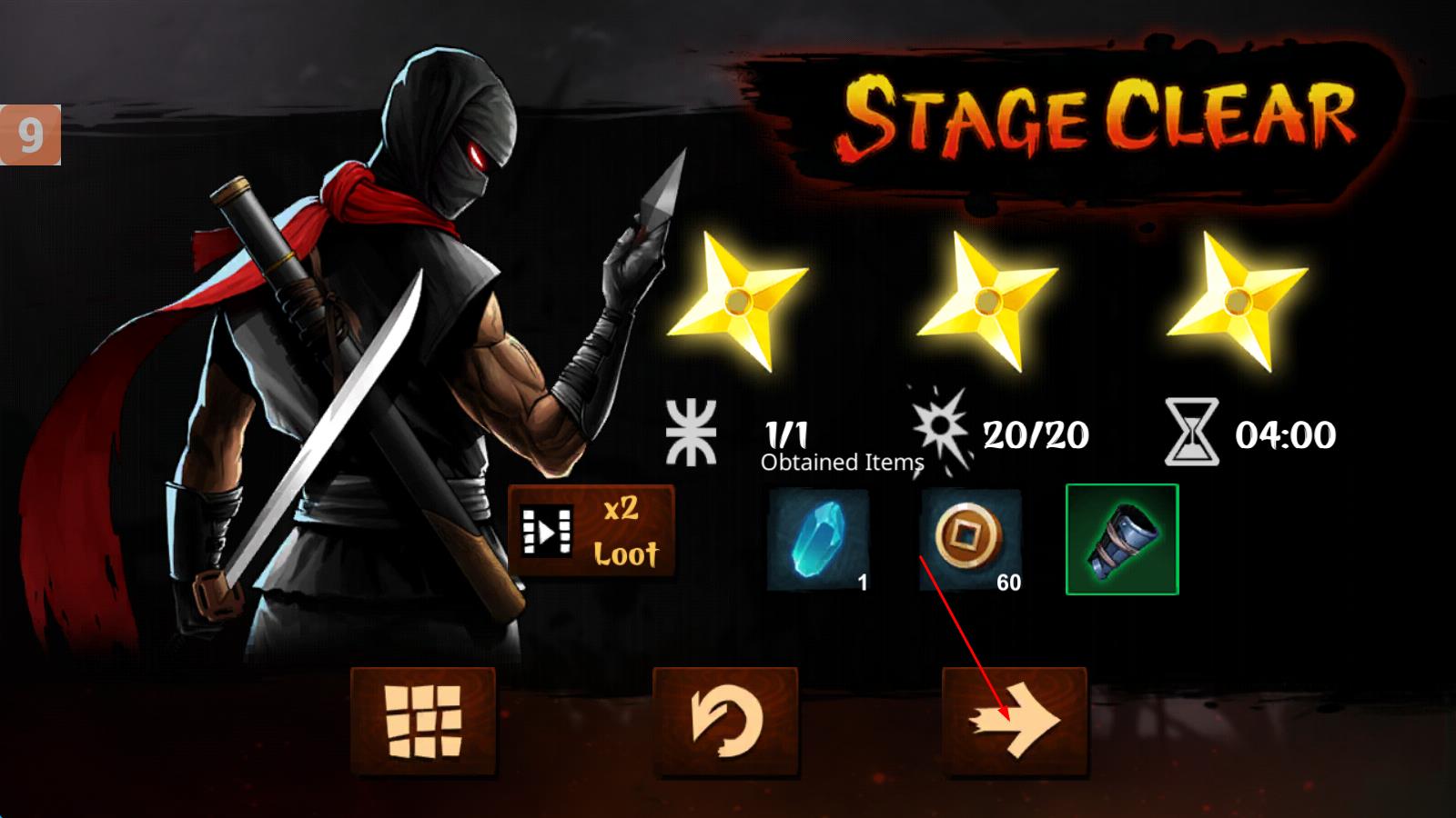 3、成功抵达大鼓并完成关卡任务后,进入结算界面,点击继续箭头,可获取奖励,开启下一段忍者武士的冒险征程。