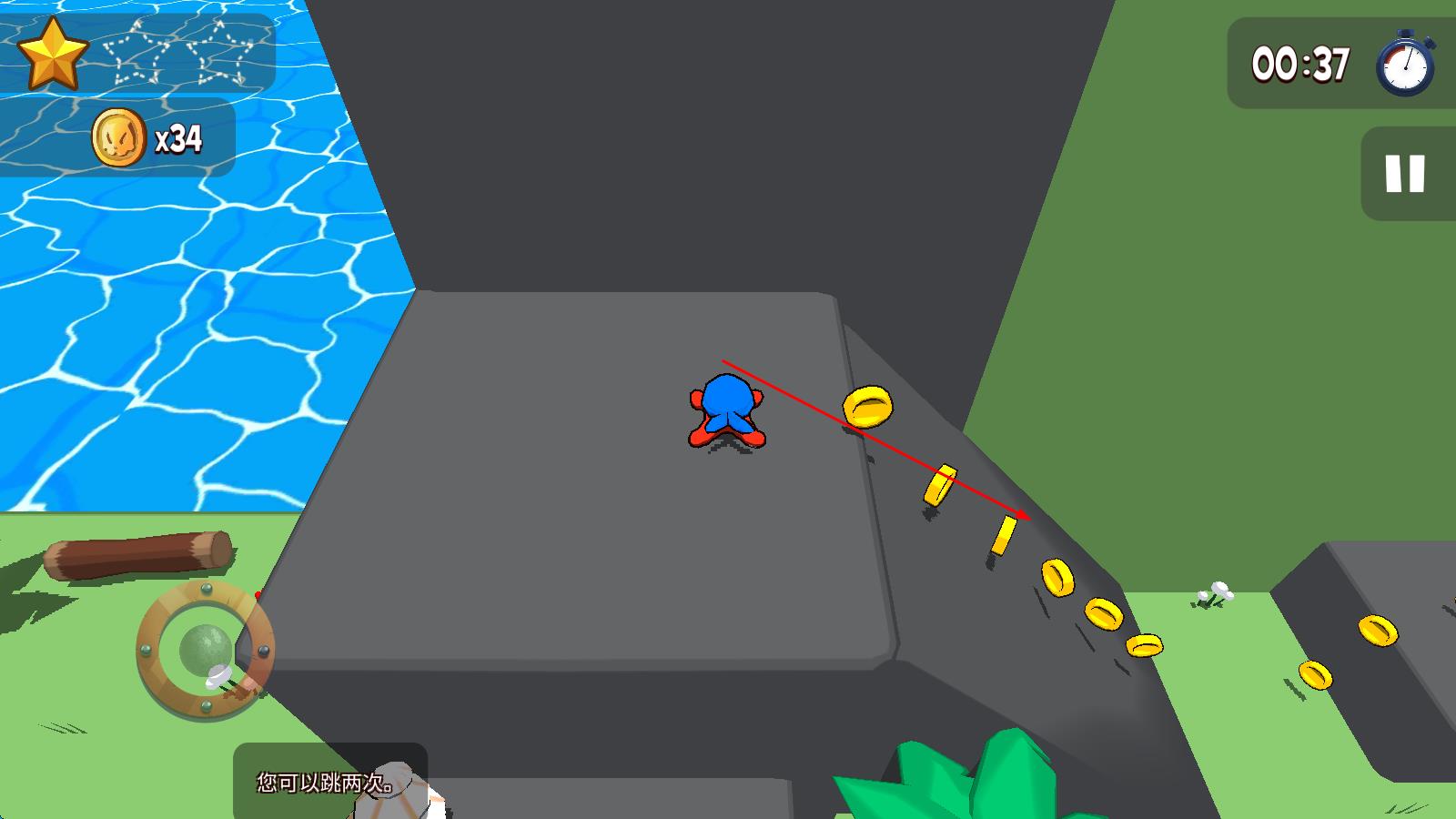 1、操控蓝色角色在场景移动,遇到带金币斜坡时,利用可跳两次机制,连续跳跃越过障碍,沿金币路径前行收集金币。