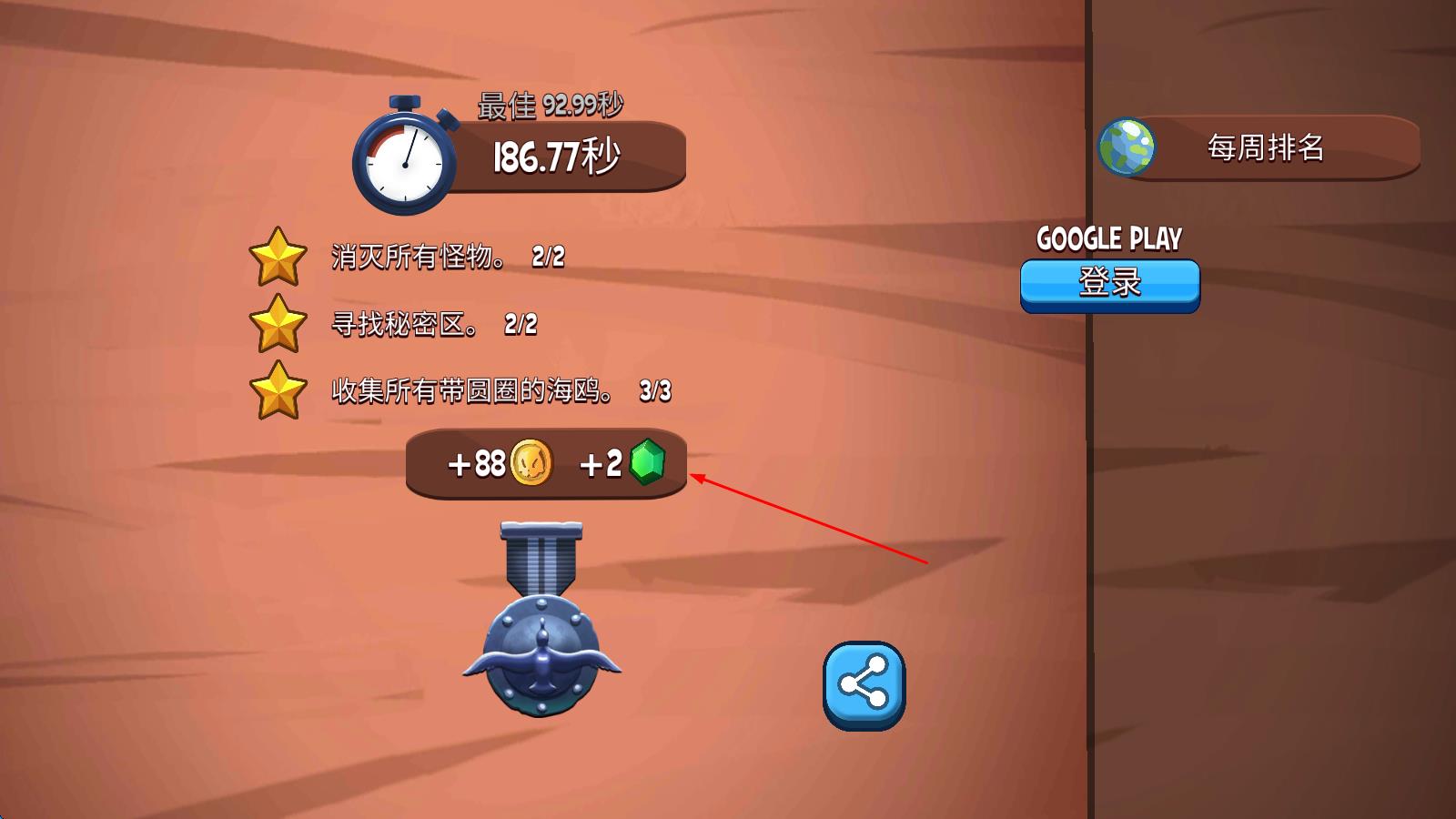 3、完成关卡后,进入结算界面,达成消灭怪物、寻找秘密区、收集海鸥等目标,获取金币与绿宝石奖励,可选择继续挑战或退出。
