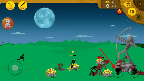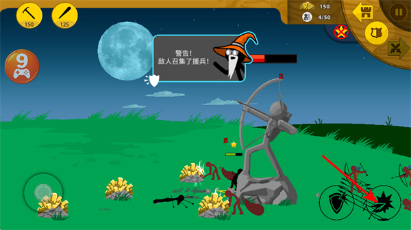 4、在战斗过程中,点击盾牌图标,可让己方火柴人单位进入防御状态,抵御敌方的远程攻击,减少部队伤亡,确保战斗的持续推进,完成目标。