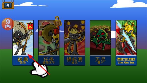1、进入游戏界面后,点击经典战役选项,可开启火柴人军团的经典战斗模式,这是熟悉游戏核心玩法的关键操作,准确点击才能进入战役关卡。