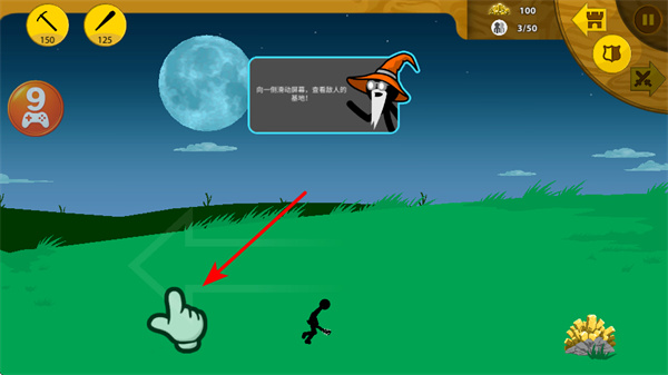 2、在游戏内,按照箭头指引的方向滑动屏幕,可操控火柴人单位移动,前往资源点敌方阵地,掌握部队移动操作的关键步骤,能让部队精准到位。
