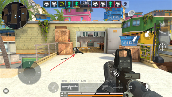 1、利用小地图观察敌人位置,借助柱子等掩体掩护,伺机发起攻击。