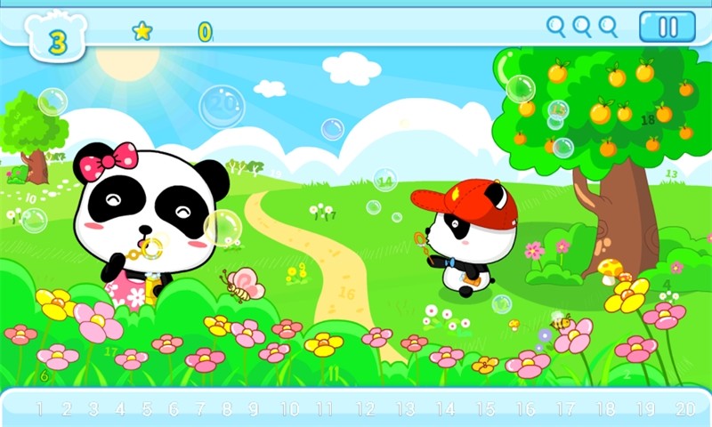 这款游戏主要培养宝宝观察力和考察宝宝对数字的认知效果。还在等什么呢?赶紧跟着可爱的熊猫宝宝进入到数字的世界,擦亮你们的眼睛,把那些散落在各处的淘气的数字们都找出来吧。