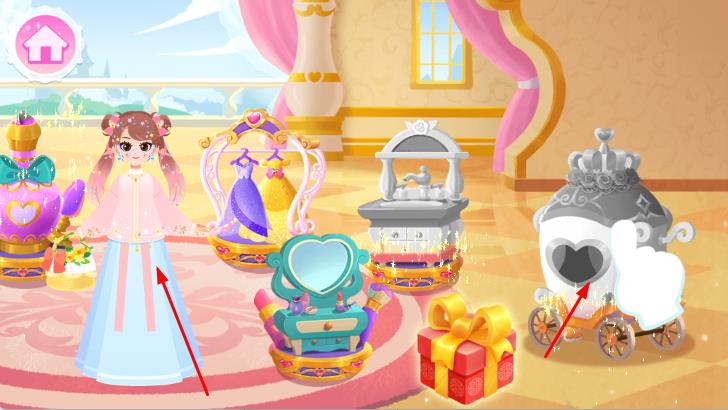 3、点击场景中可以解锁的的道具,对公主的发型、配饰等进行进一步调整,帮助公主展现出最佳形象。