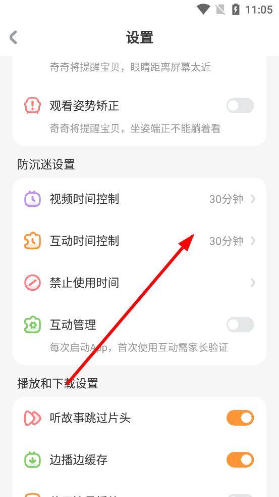 3、在设置页面的防沉迷设置板块,点击视频时间控制或互动时间控制选项,选择或自定义想要设置的时间限制即可。