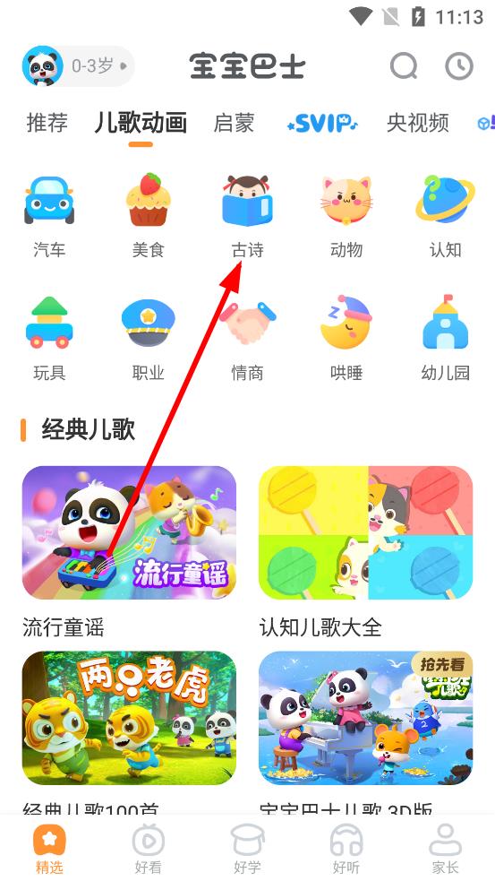 3、进入古诗页面后,在精选视频板块,选择喜欢的古诗视频或唱读内容,点击即可播放收听。