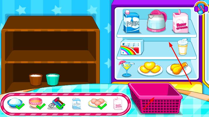 1、进入游戏,在主界面点击Play按钮,进入食材准备环节,在冰箱中选择对应的食材,点击食材将其放入粉色的篮子中。