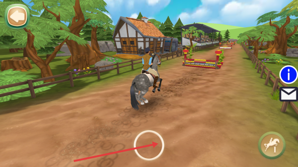 2、骑马闯关时,移动下方的圆圈操控角色沿赛道前进,遇障碍提前调整方向,点击跳跃按钮右下角让马跨越。