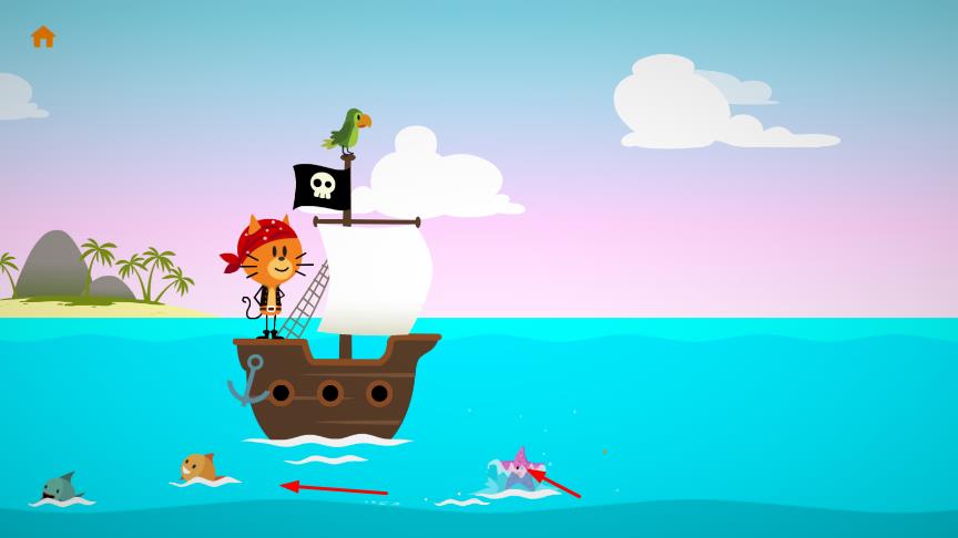 2、进入海洋场景,操控的海盗船在蓝色海面上航行,航行过程中会遇到各种海洋生物和物品,通过点击或滑动屏幕与这些元素互动。