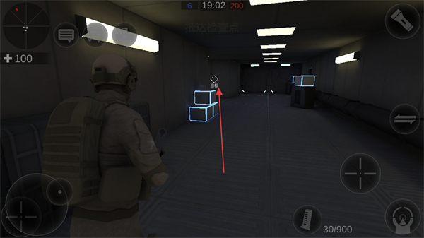 2、抵达检查点,注意场景中的互动元素如蓝色方块,完成区域探索。