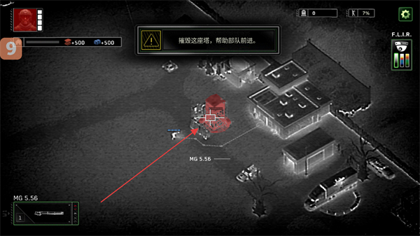 2、按提示操控MG5.56武器,清理道路上的僵尸,协助部队前进。