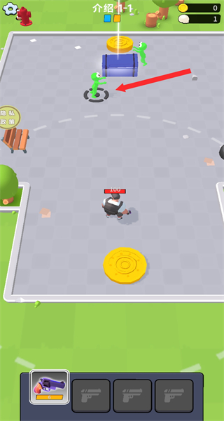 2、在关卡中操控角色移动,朝着箭头指向的道具如白色骷髅前进,靠近后拾取道具,为后续狩猎丧尸做准备。