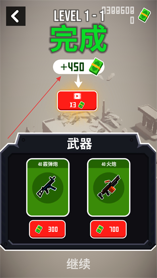4、成功消灭所有敌人后,完成LEVEL1-1关卡,领取450金币奖励,可选择解锁新武器,点击继续进入下一关。