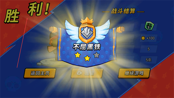 4、击败所有敌人后显示胜利,获得不屈黑铁评级,可选择继续游戏。