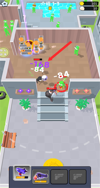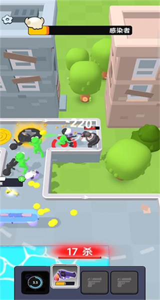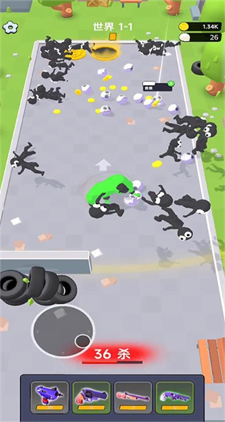 3、遇到集群的绿色丧尸时,切换底部更强力的武器如紫色武器,提升攻击效率,快速击败多个丧尸目标。