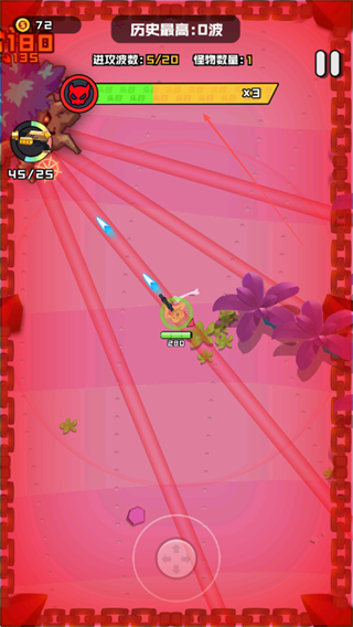 1、操控角色移动通过下方虚拟摇杆,射击消灭Lv.3、Lv.4等不同等级的怪物,积累金币和经验,提升进攻波数。