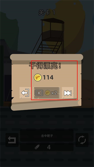 4、击中靶子后弹出提示框显示干得漂亮及114金币,可选择返回观看视频翻倍奖励或进入下一关。