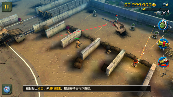 1、在战场点击目标进行射击,摧毁敌方单位,可拖动目标调整射击方向,持续推进。