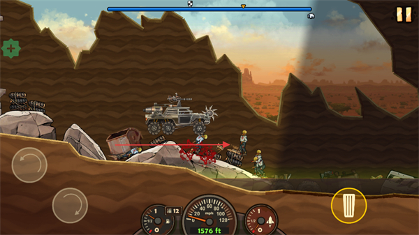 3、车辆可在不同地形如水域、山地行驶,碾压僵尸和障碍物,积累行驶距离。
