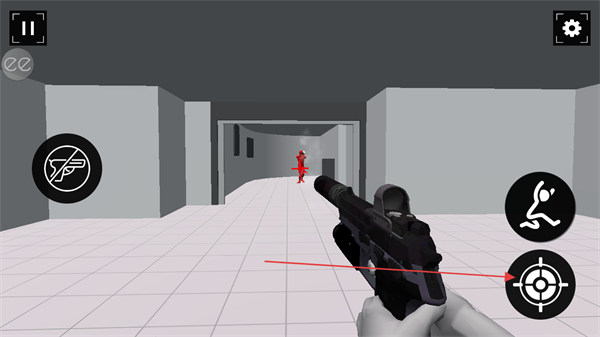 4、点击瞄准按钮,精准射击远处红色敌人,消灭目标推进游戏。