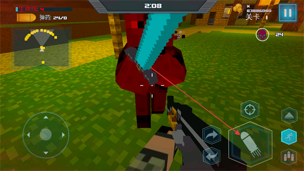 3、瞄准红色敌人,使用枪械射击,注意自身生命值和弹药量。