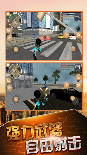 具有超高自由度的,以能力极强的火柴人为主角的第一人称动作射击类单机手游超级闪电火柴人英雄。火柴人初期只有一把枪和钩锁,随着任务获得的各种酬劳和在黑恶势力上搜刮到的钱财,玩家可以去商店购买各种武器装备自己,使得火柴人获得极强的战斗力。