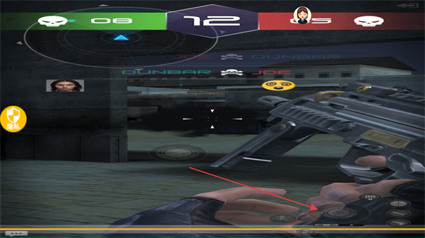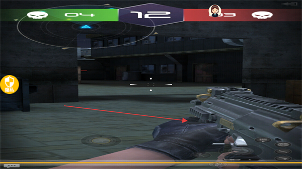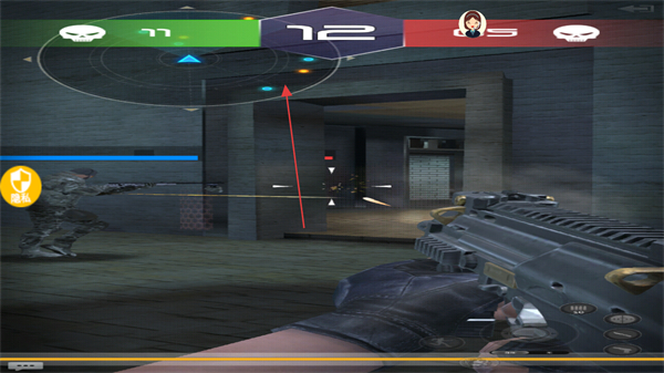1、在对战场景中,观察上方分数和敌方位置,操控枪械瞄准,准备射击。