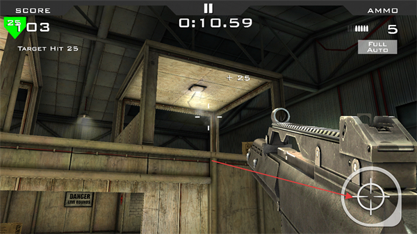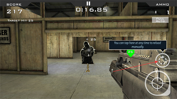 1、瞄准带有绿色25标识的目标射击,积累分数,注意剩余弹药和时间。