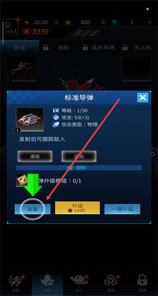 2、切换到战机配置界面,在装备栏中选择可使用的武器如“标准导弹”,选中目标武器,准备进行装备操作。