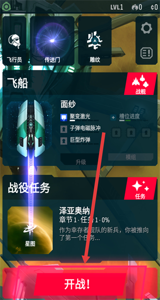 2、在确认飞船的配置后,点击开战按钮,启动战役任务,进入太空射击的战斗场景。