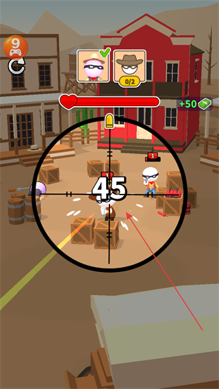 2、通过瞄准镜锁定敌人,精准射击,减少其生命值,完成击杀目标。