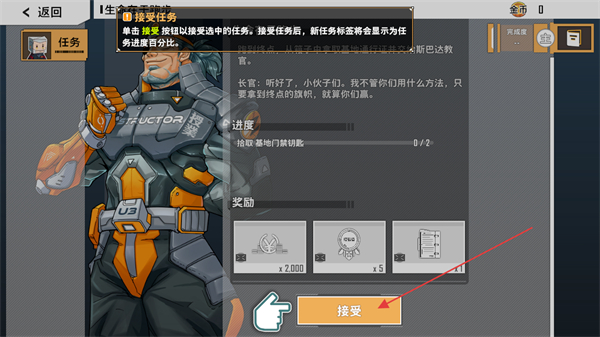 2、在任务界面,点击接受按钮,接取任务,任务目标将显示为任务进度百分比。