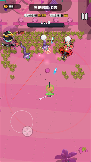 1、操控角色移动通过下方虚拟摇杆,射击消灭Lv.1、Lv.2等不同等级的怪物,积累金币和经验。