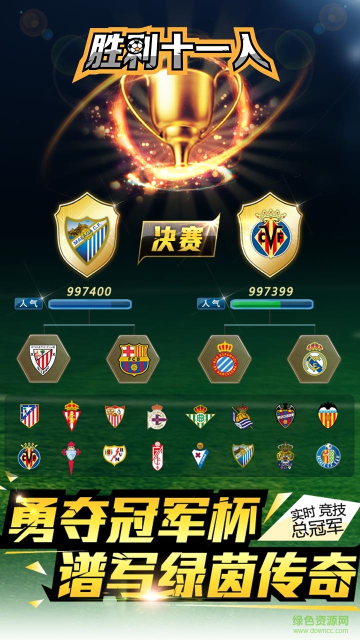 胜利十一人是一款火爆的足球手游,喜欢踢足球的朋友们千万不要错过了。游戏画面细腻,各种明星球员等你来搜集。实时对战,技术与战术同样重要。还等什么,快约上你的小伙伴,一起来绿色资源网踊跃下载吧!