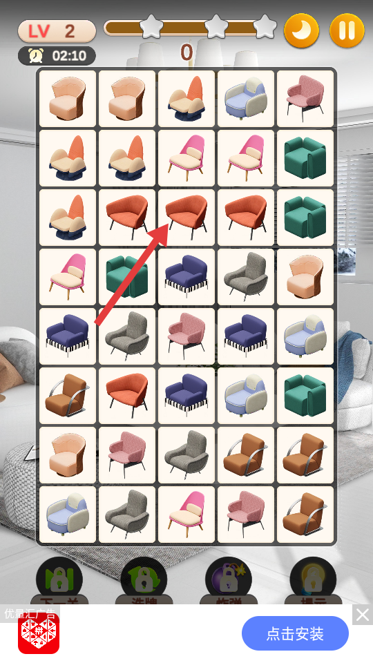 2、消除过程中若遇到卡关,可使用积累的金币兑换提示次数,快速找到可匹配图案,同时留意步数与时间,避免关卡失败浪费金币机会。