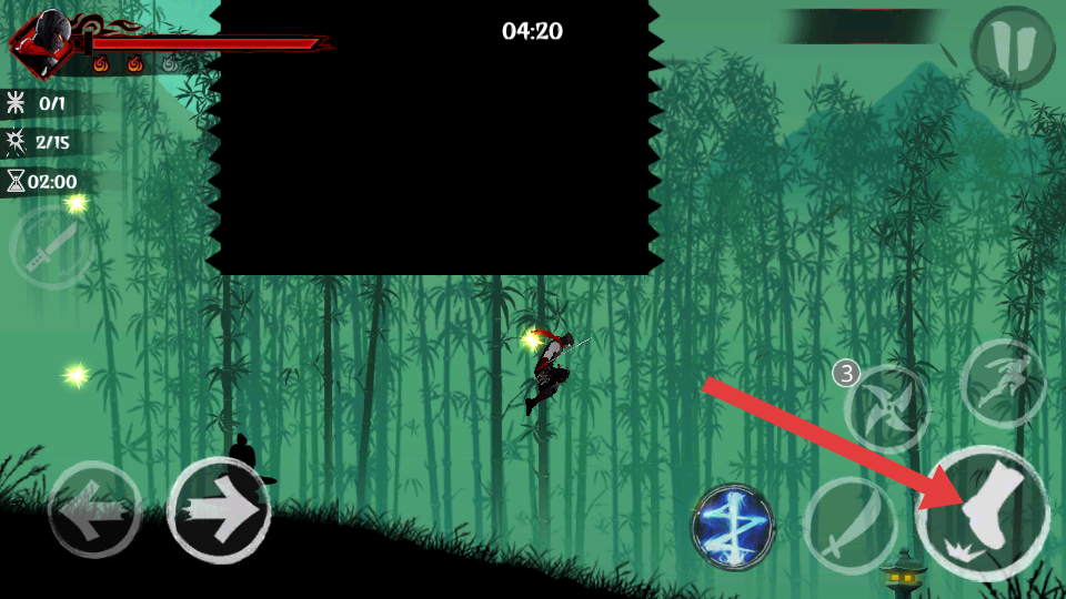 1、进入竹林场景后,利用左侧方向键灵活移动角色,躲避敌人从不同方向发起的攻击,可快速向左右移动,避开其下落攻击范围。