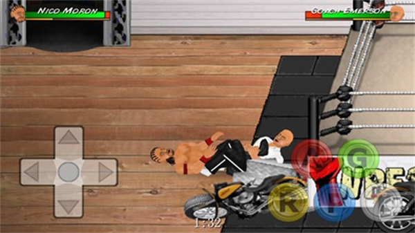 1、十字方向键控制摔角手移动,可在擂台内外自由行走,靠近对手或躲避攻击时调整站位。