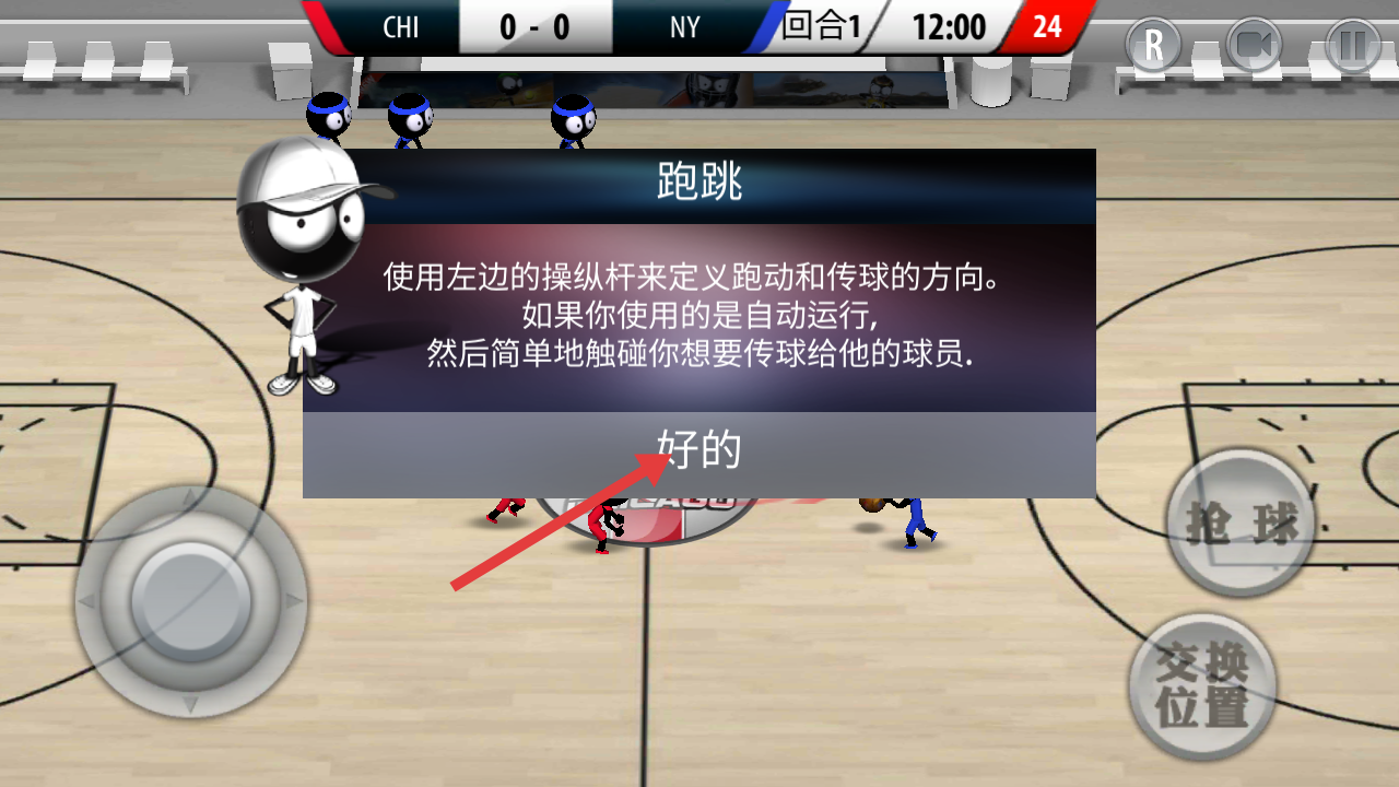 1、进入游戏后,先跟随教程熟悉操作界面,学习虚拟摇杆控制球员移动,点击投篮键练习近距离投篮,掌握基础动作要领。
