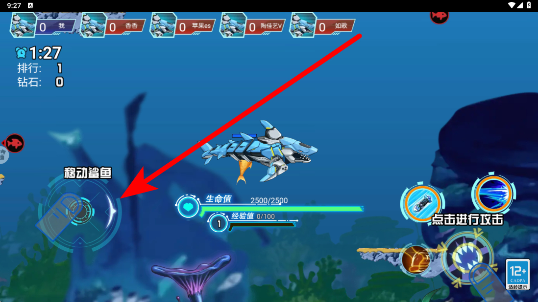 1、进入应用后,在战斗界面,通过左侧操作区域操控机甲鲨鱼移动,灵活调整位置,以更好应对战场情况,寻找合适的战斗时机。