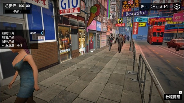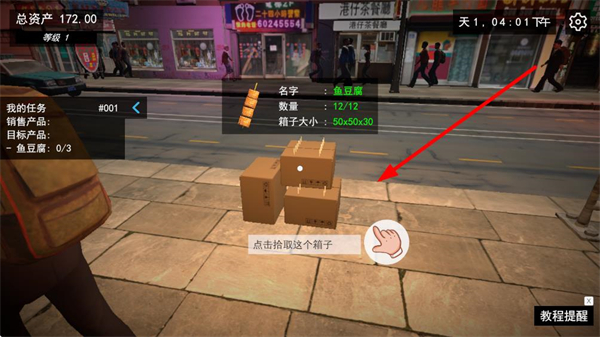 3、移动虚拟摇杆控制角色到餐厅门口,拾取地上采购的包裹,控制角色返回店铺餐桌。